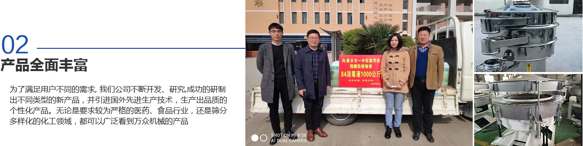 新鄉市萬眾機械設備有限公司是生產振動機械、篩分設備和過濾設備的專業(yè)廠家之一,擁有生產設備、雄厚的技術力量、完善的檢測手段、嚴格的管理體系。是河南省的商標之一,被河南省科學技術廳頒定為高新技術企業(yè),為新鄉市“守合同重信用企業(yè)“。質量信得過產品、質量服務消費者滿意企業(yè)、合格產品等榮譽稱號。擁有自主進出口經營權,產品遍布各地,并遠銷北美、西歐及東南亞等地區(qū)。